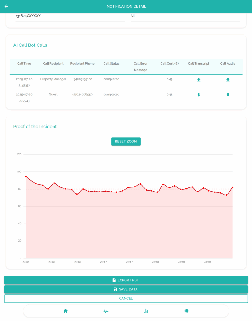 Jeder Vorfall wird mit Zeitstempeln und Daten protokolliert und bildet somit eine verlässliche Aufzeichnung für OTAs, Versicherungsansprüche oder behördliche Vorschriften. Im Falle von Streitigkeiten verfügen Sie stets über Nachweise, um Ihr Unternehmen und Ihren Ruf zu schützen.
